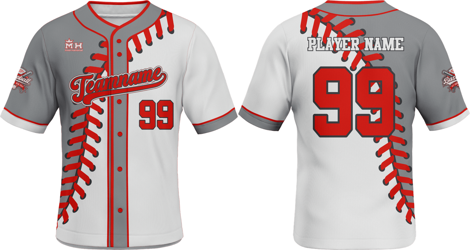 Elevate your game with our custom baseball jerseys, designed for comfort, performance, and style. Featuring a bold half-gray and half-white layout with striking red baseball stitch graphics, these jerseys are fully customizable with your team name, player name, and number.